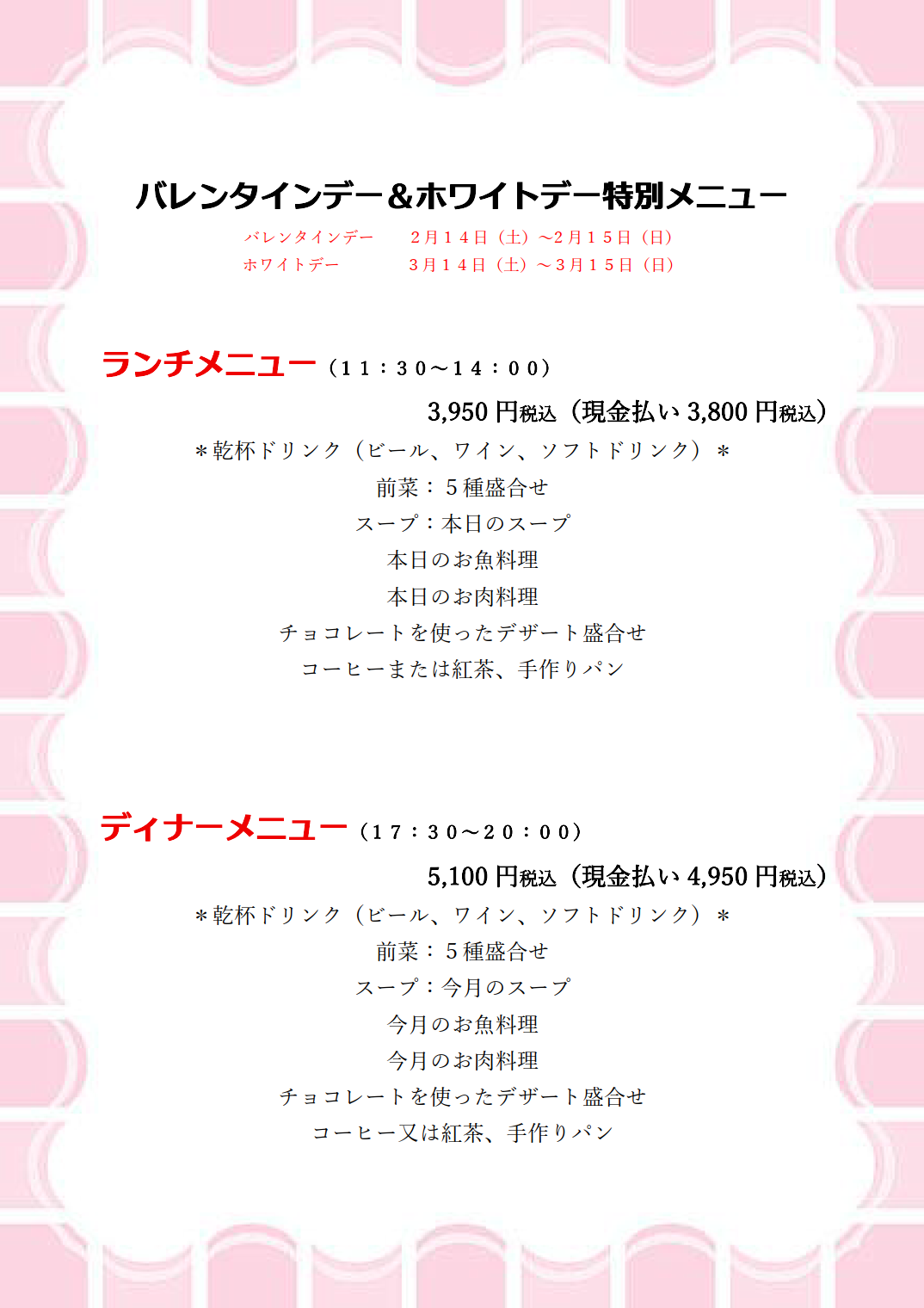 バレンタインデー(2/14、15) & ホワイトデー(3/14、15)、期間限定の特別コースをご用意しました。大切な人と、素敵なひとときをお過ごしください。